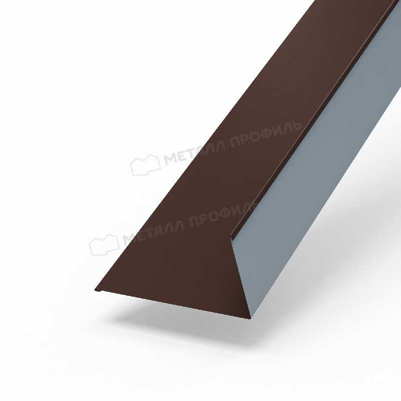 Деталь кровли защищает линию примыкания ската к вертикальной стене. Металл 0.5 мм выдерживает давление скопившегося снега зимой. Слой NormanMP предотвращает коррозию внутреннего угла крыши. Тон RAL 8017 совпадает с оттенком основной металлочерепицы. Конструкция профиля перенаправляет жидкость в водоотводный канал.