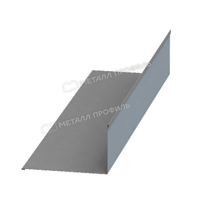 Деталь кровли защищает линию примыкания ската к вертикальной стене. Металл 0.45 мм выдерживает давление скопившегося снега зимой. Слой Полиэстер предотвращает коррозию внутреннего угла крыши. Тон RAL 7004 совпадает с оттенком основной металлочерепицы. Конструкция профиля перенаправляет жидкость в водоотводный канал.