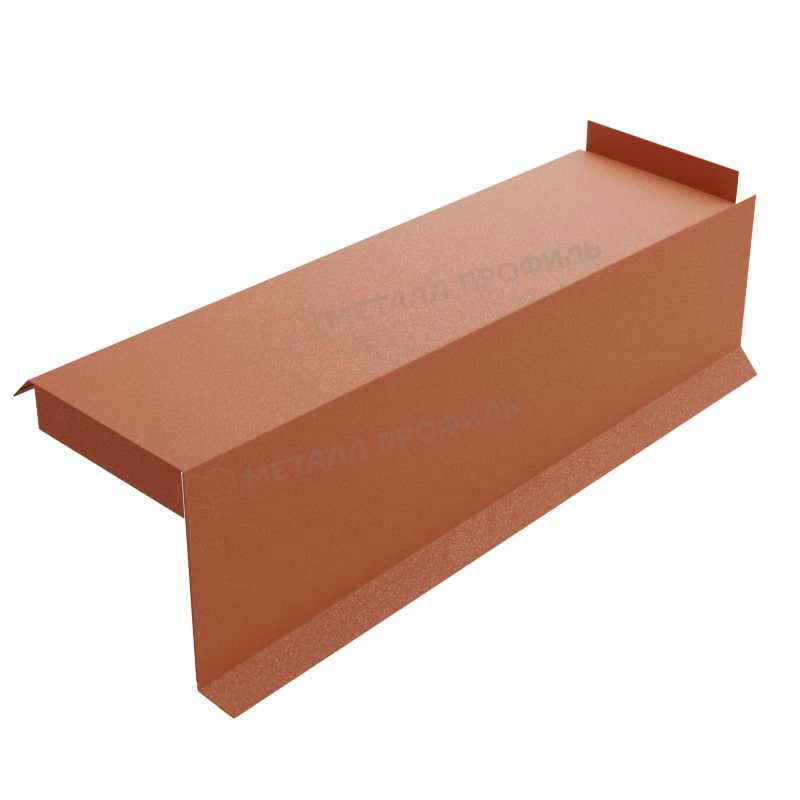 Профиль торца завершает архитектурный контур кровельной системы здания. Лист толщиной 0.5 мм препятствует излому при физическом воздействии. Покрытие VikingMP® E переносит контакт с влажной средой, а оттенок RAL 8004 гармонирует с фасадом дома. Сборка узла спасает стропила от намокания и гниения.