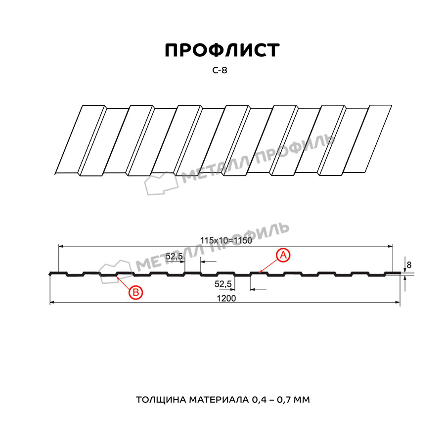 Профиль МП-20 характеризуется трапециевидной формой с высотой волны 20 мм, что придает ему повышенную жесткость. Ширина листа составляет 1150 мм (полезная 1100 мм), длина нарезается по заказу до 12 метров. Такая конфигурация позволяет использовать его в конструкциях, требующих высокой несущей способности, как в промышленных, так и в частных проектах.