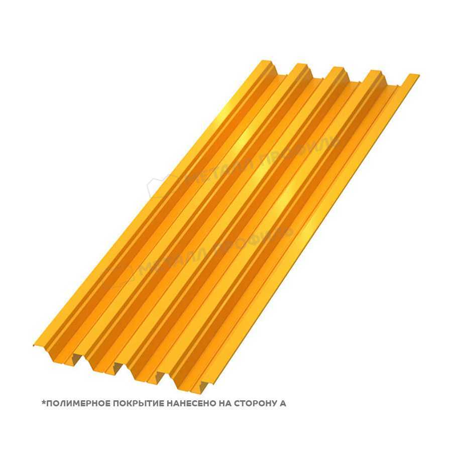 Профиль листа формирует прочное покрытие кровли или фасада. Сталь толщиной 0.7 мм — база несущей способности материала. Покрытие Полиэстер отталкивает влагу от стальной основы. Цвет RAL 2004 сохраняет насыщенность под прямыми лучами солнца. Установка панелей идет с нахлестом в одну волну.