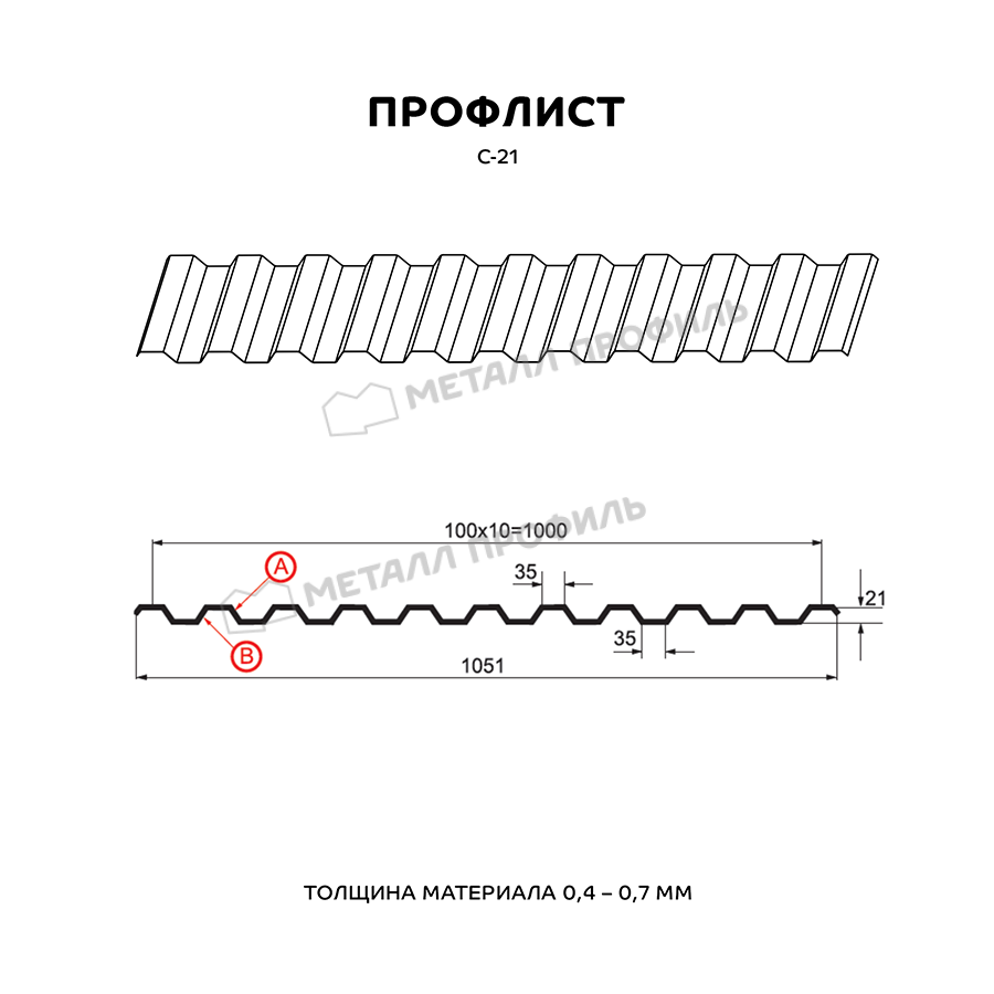 В коллекции доступны толщины от 0,4 до 0,7 мм, что позволяет выбрать материал под конкретные нагрузки, от легких заборов до промышленных крыш.