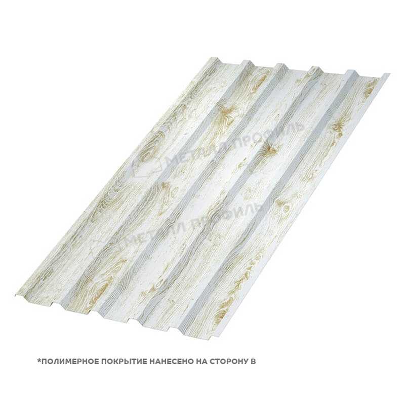 Профлист Металл-Профиль МП ECOSTEEL® матовый 0.5 мм в оттенке Беленый Дуб представляет собой высококачественный материал для строительства и отделки. Это стальной лист с полимерным покрытием, имитирующим натуральное дерево, который сочетает прочность металла и эстетику древесины. Идеален для заборов, кровли и фасадов, обеспечивая долговечность и привлекательный вид.