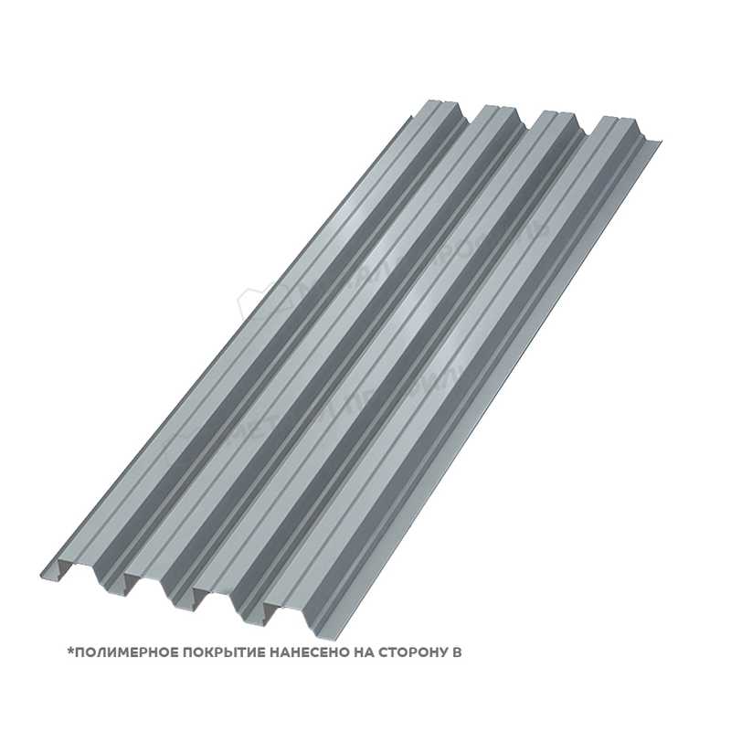 Профиль листа формирует прочное покрытие кровли или фасада. Сталь толщиной 0.8 мм — база несущей способности материала. Покрытие Полиэстер отталкивает влагу от стальной основы. Цвет RAL 7004 сохраняет насыщенность под прямыми лучами солнца. Установка панелей идет с нахлестом в одну волну.