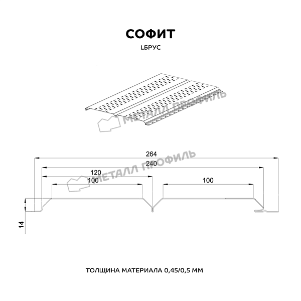 Софит — это специальные панели из серии Lбрус, оснащённые перфорацией на лицевой стороне. Они предназначены для подшивки карнизных свесов кровли. Благодаря аккуратному внешнему виду софит придаёт зданию завершённость и эстетическую целостность. Перфорированные отверстия обеспечивают вентиляцию подкровельного пространства, предотвращая скопление конденсата, а также развитие плесени и грибка.